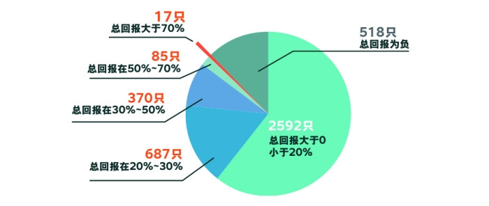 根据Choice统计数据,在4269只主动偏股型基金中,农历龙年的算术平均收益率为14.09%。其中,取得正收益的基金有3751只,总回报超过20%的基金有1159只,总回报超过30%的基金有472只,总回报超过50%的基金有102只,更有17只基金的总回报超过70%。